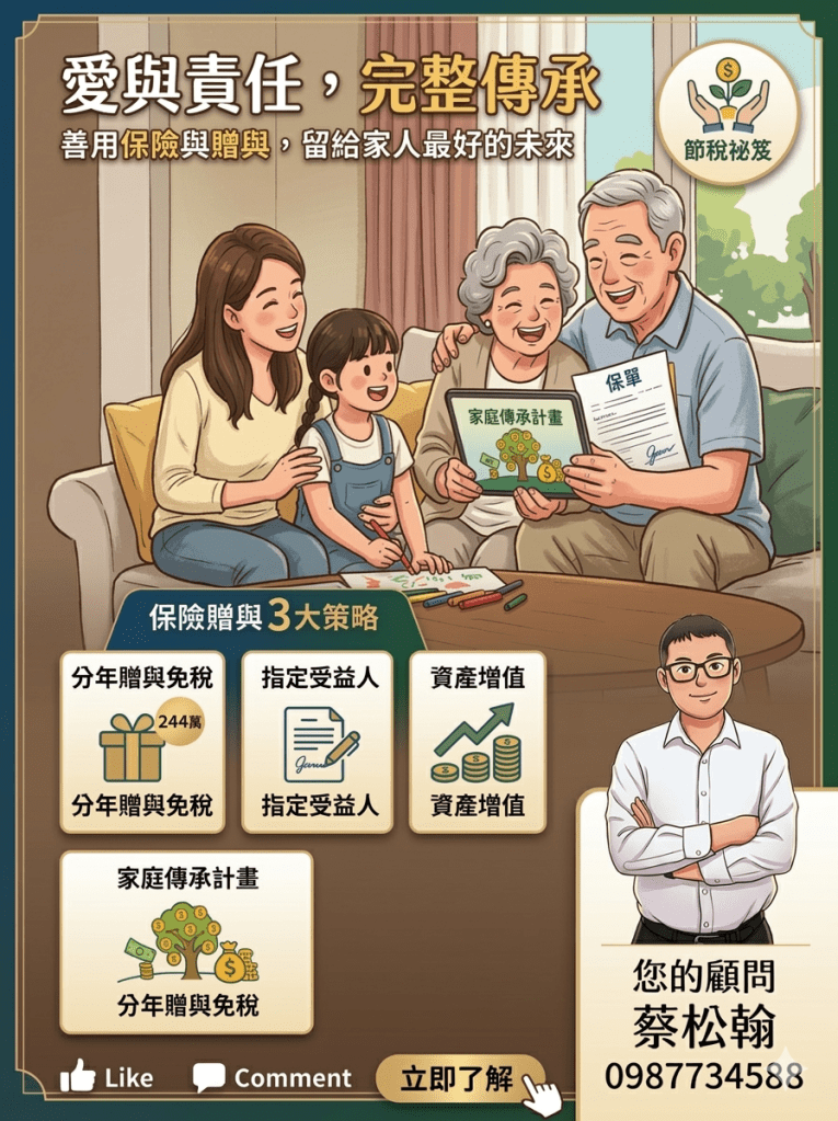 在下方留言「+1」或私訊我,我幫你免費檢視保單架構,讓你的愛完整傳承!
